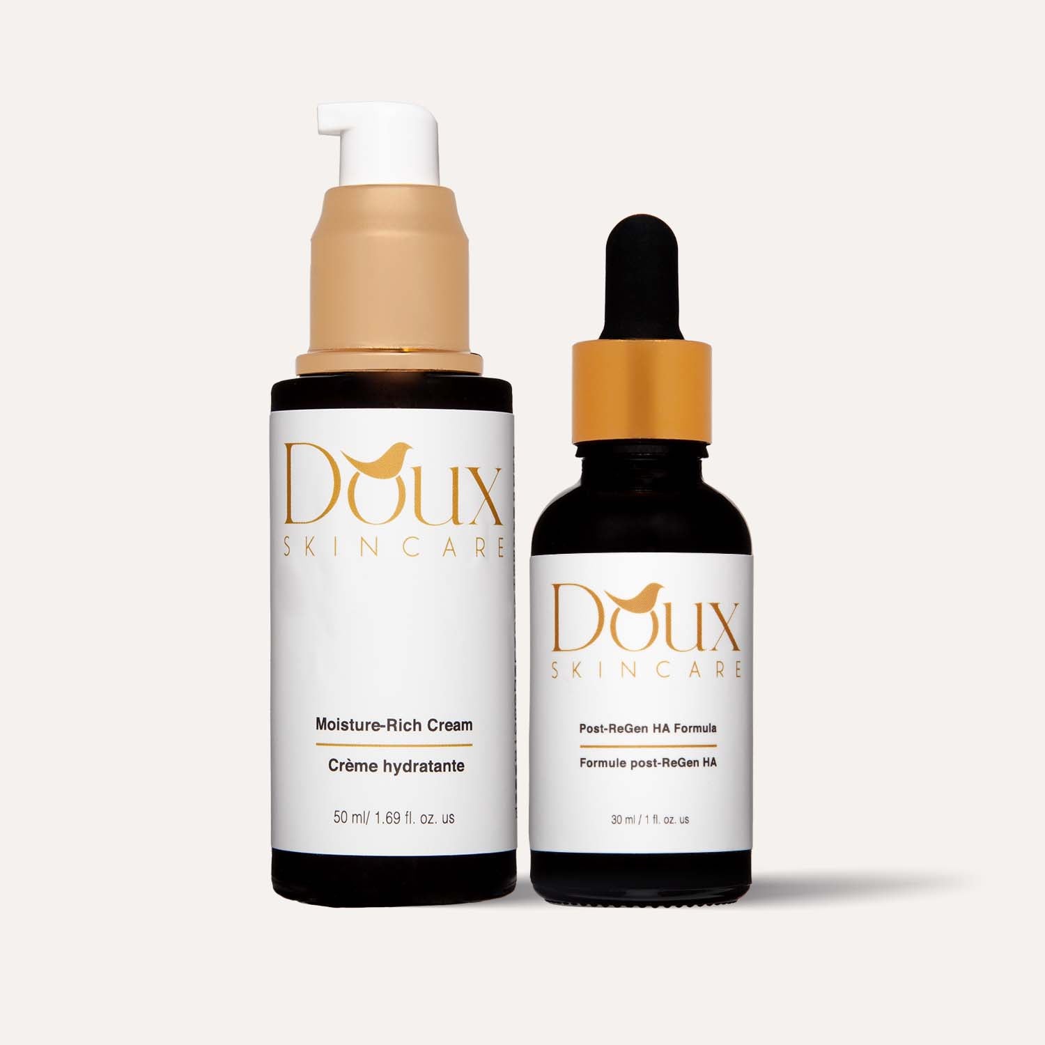 Use a thin coat of DOUX's POST-REGEN HA FORMULA during microneedling as your gliding gel. Apply to one section at a time.